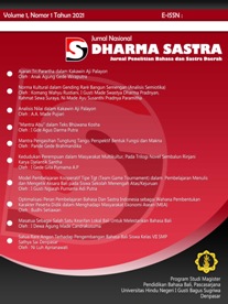 Dharma Sastra : Jurnal Penelitian Bahasa dan Sastra Daerah merupakan jurnal ilmiah nasional yang memuat tentang hasil penelitian bahasa dan sastra daerah. Jurnal ini mencakup kaidah kebahasaan sekaligus didedikasikan untuk pelestarian bahasa daerah nusantara. Upaya ini sangat penting sebagai edukasi keanekaragaman bahasa daerah termasuk pengetahuan nilai-nilai yang terkandung dalam ragam sastra daerah nusantara. Dharma Sastra diterbitkan dua kali dalam setahun oleh Prodi Magister Pendidikan Bahasa Bali Universitas Hindu Negeri I Gusti Bagus Sugriwa Denpasar.