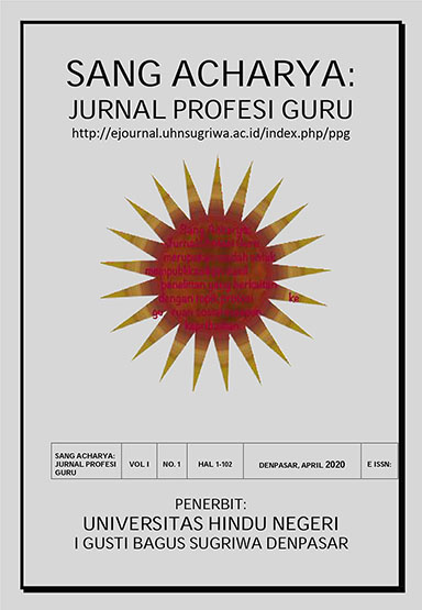 Sang Acharya: Jurnal Profesi Guru merupakan jurnal yang diterbitkan secara online dengan nomor e-issn 2722-8614, wadah untuk mempublikasikan hasil penelitian yang berkaitan dengan topik profesi keguruan, yang meliputi pengembangan kompetensi pedagogie, profesional, sosial maupun kepribadian. Jurnal ini terbit dua kali dalam setahun pada Bulan April dan Oktober.