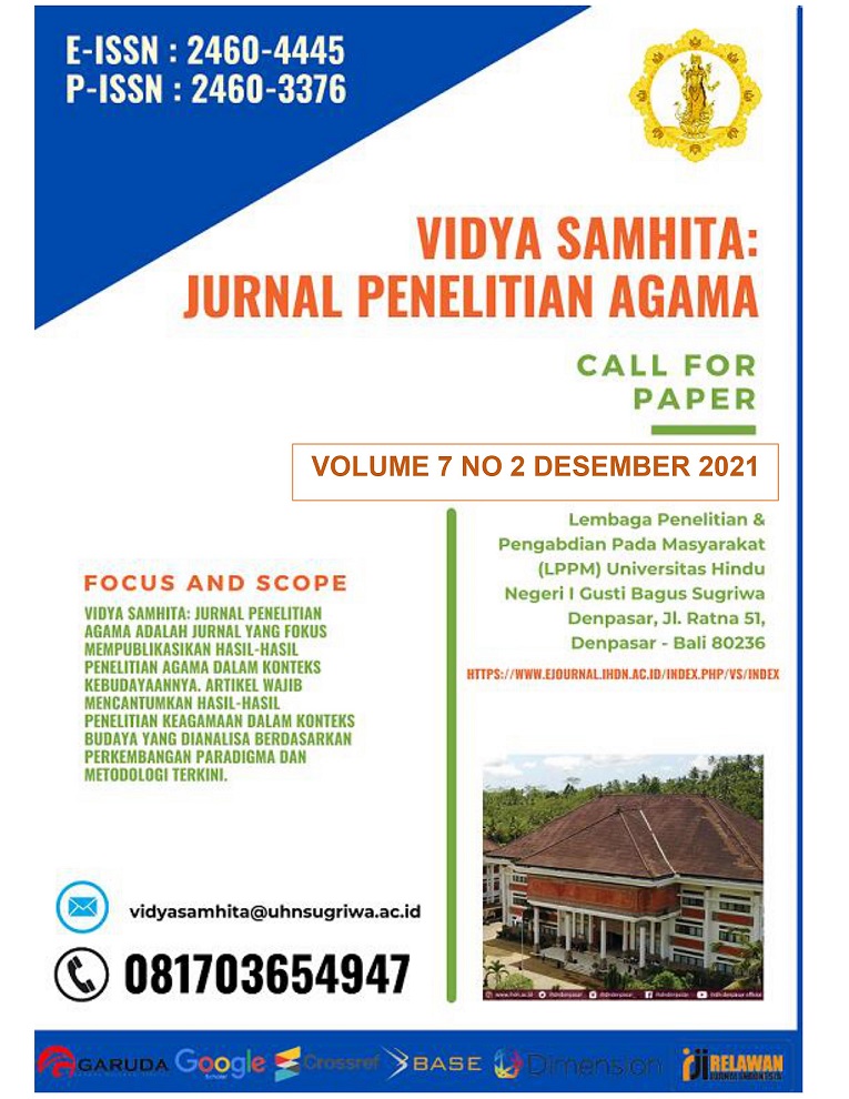 VIDYA SAMHITA: Jurnal Penelitian Agama dengan ISSN cetak 2460-3376 dan ISSN online 2460-4445 merupakan Media Ilmiah Nasional yang digunakan sebagai wahana untuk mengekspresikan berbagai hasil penelitian ilmiah bidang Agama dan Budaya. Vidya Samhita dikelola dan diterbitkan oleh Universitas Hindu Negeri I Gusti Bagus Sugriwa Denpasar.